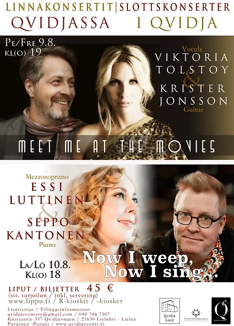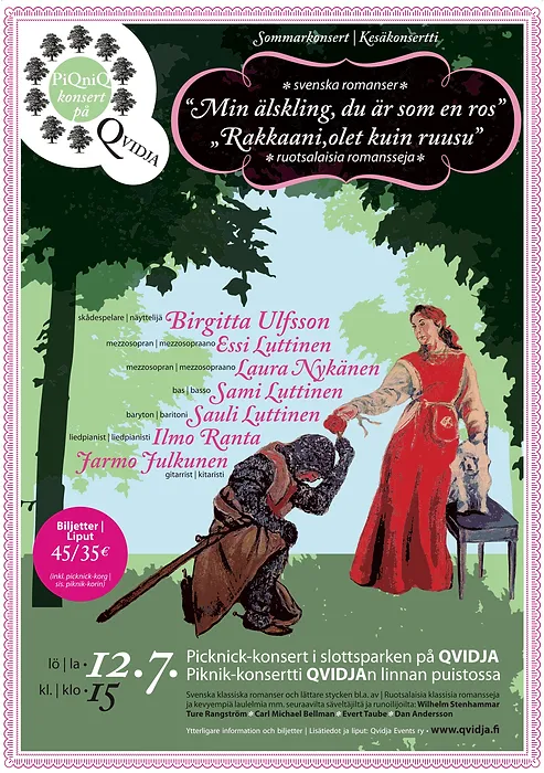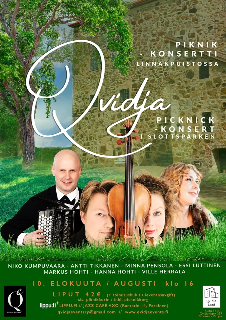 Jo kahtenatoista kesänä on Qvidjan linnan puistossa järjestetty korkeatasoisia konsertteja, joiden teemat ovat vaihdelleet barokkimusiikista tangoon ja oopperasta jazziin. Konserttilipun hinnalla yleisömme on saanut nauttia paitsi upeista musiikillisista elämyksistä ja ainutlaatuisesta miljööstä, myös herkullisen piknik-korin antimista.